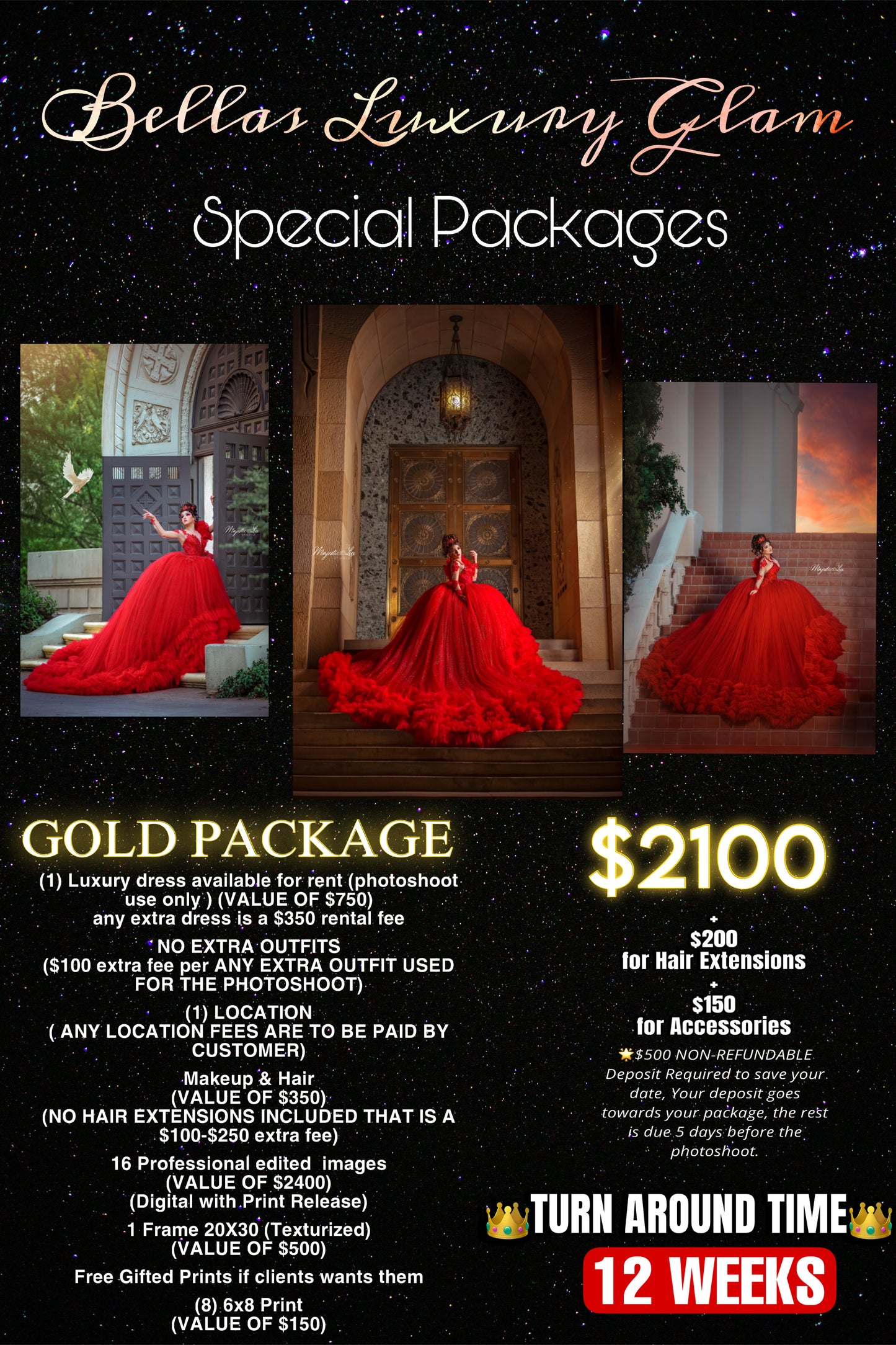 Hello good morning , Our packages INCLUDE THE RENT OF YOUR DRESS with Crinolines, MAKEUP, HAIR AND YOUR PHOTO SESSION, we also gift you accessories for you to choose from to use for your session